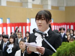 在学生代表の鎌田ひかるさんによる歓迎の辞では、「初めから「うまくやっていく」なんて考えなくてもいいのです。下手くそでも、右左がわか らなくても、泥だらけでもいい。そのまま、とにかく足掻いてみてください。足掻き続けた先にきっと新しい自分が、道が見えるはずです。手を動かし続けた先に光はあるのです。」と新入生への激励の言葉がありました。